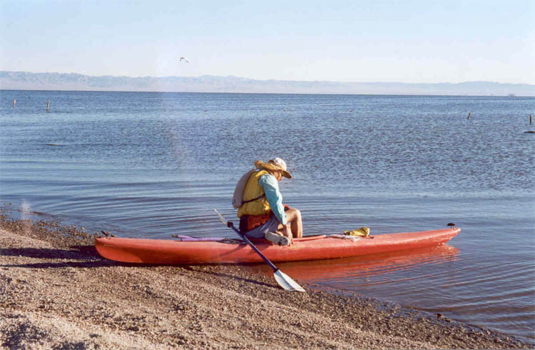 The water is calm and there is just a slight breeze, but as I look ahead, I am startled to see Mullet Island just ahead. I look to the right at the shore, but I see what looks like shrubs incredibly far away. I am puzzled as to how I got so far from the shore. I turn 90 degrees and paddle quickly towards the shore. After 15 minutes, I am still not anywhere near the shore and a slight feeling of panic comes over me. I remember the underwater currents supposedly present in this area. Maybe that's what pulled me to the island and now that same current is making it hard for me to return to the shore. As fast as I was paddling, I should have covered a mile in 15 minutes. I am also a little nervous about the increasing wind. Another 10 minutes of frantic paddling finally brings me close to the shore. As I relax slightly, I become aware of my pressing need to urinate. I can be on the shore in a few minutes, but I don't wait. I want to be far away from the island. Only after I paddle along the shore for another half hour, do I get to the shore, empty the kayak and take a break. A few more hours of paddling brings me to the finish line at Niland County Park (map point 1). We load the kayak onto the car, take one last look at the shimmering Sea and head for Banning.